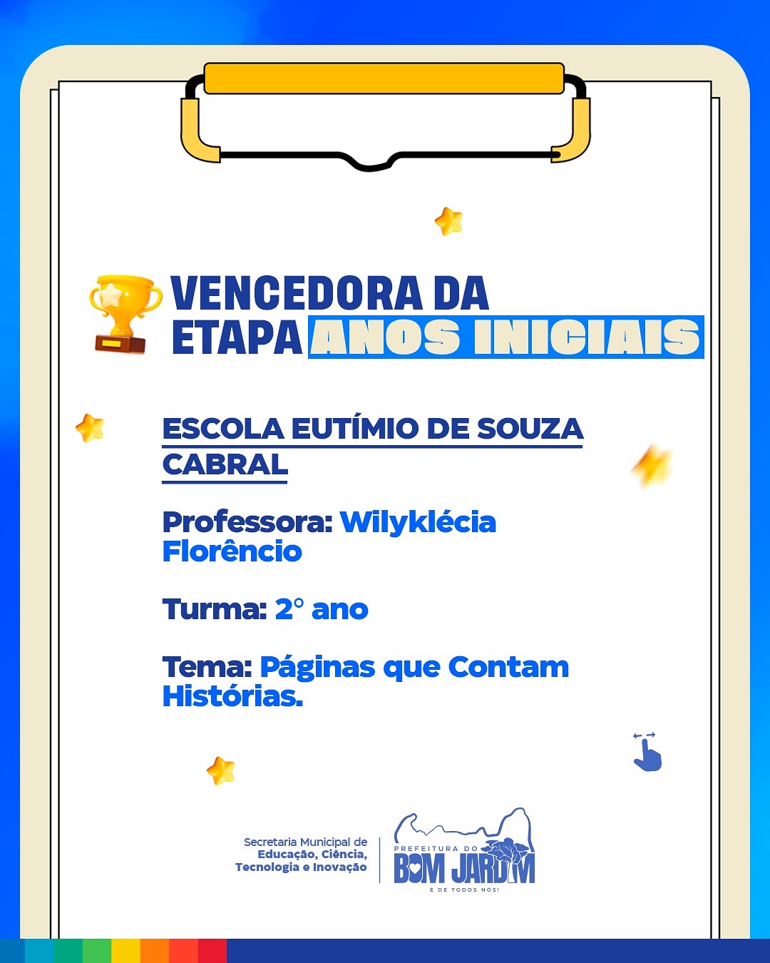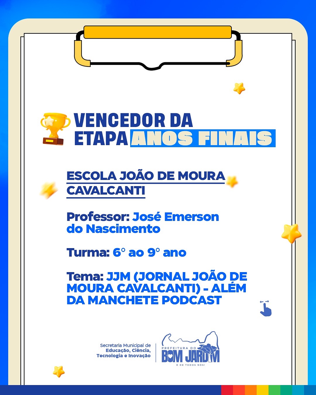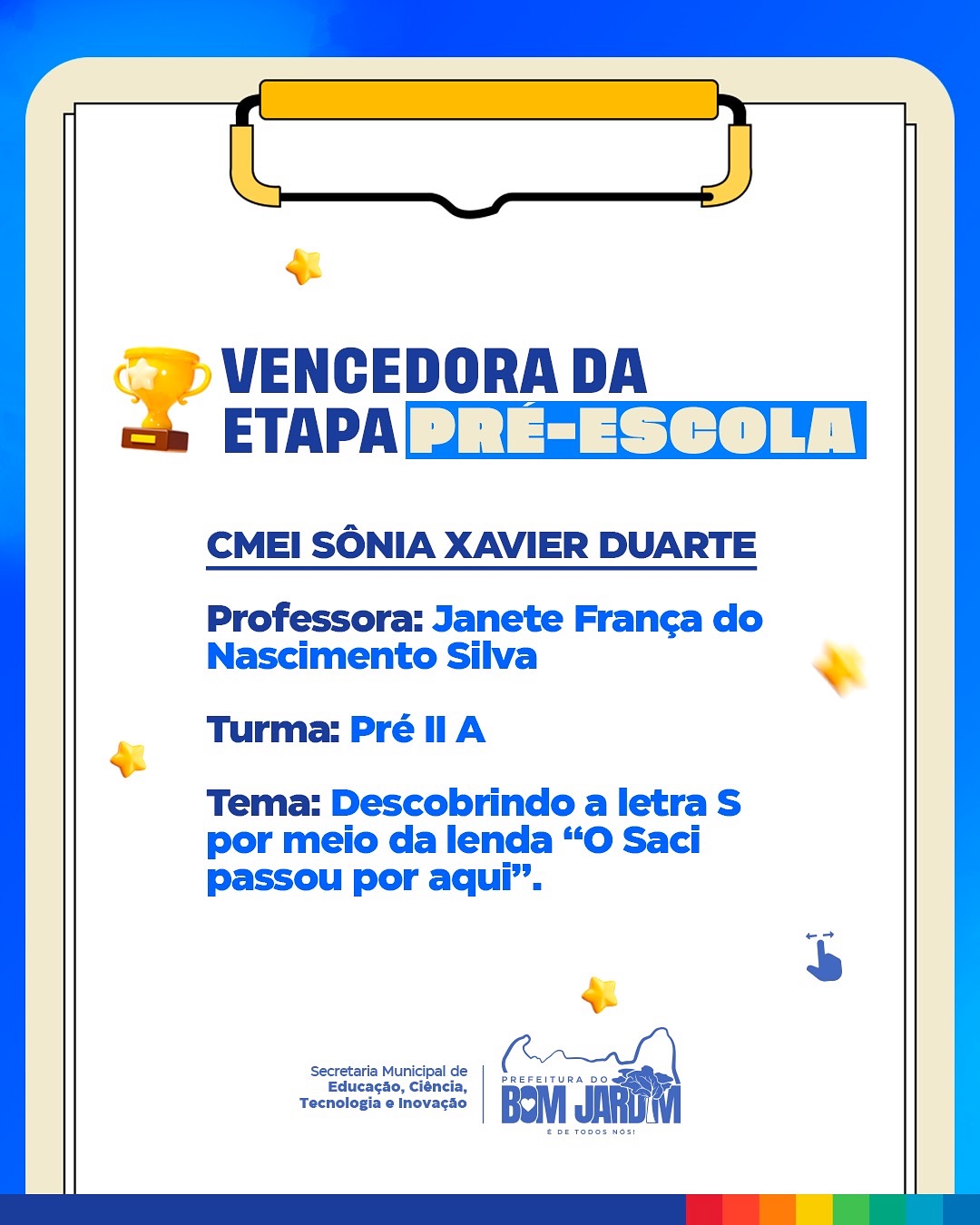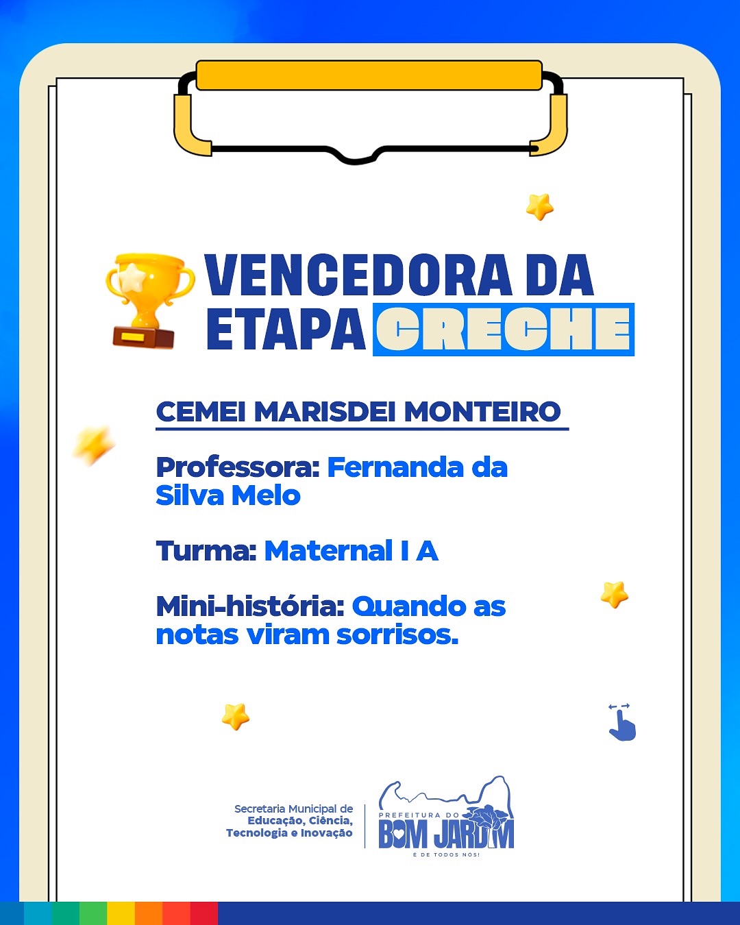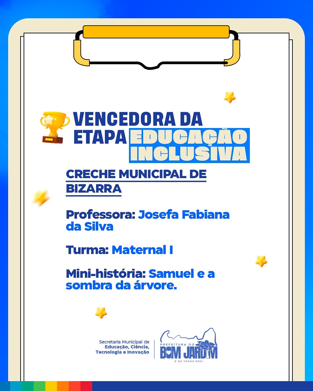Inovação e Excelência na Educação de Bom Jardim! 📚 Celebramos o sucesso da Mostra Municipal de Boas Práticas – 2025! A Mostra é um verdadeiro palco para a criatividade e o empenho dos nossos professores, que apresentaram projetos inovadores e transformadores em todas as etapas de ensino: Creche, Pré-Escola, Anos Iniciais, Anos Finais e Educação Inclusiva. Parabenizamos todos os participantes e, em especial, os professores que demonstraram a excelência e a paixão pela educação em nossa rede. Continuaremos investindo em uma educação de qualidade, ciência e inovação para o futuro dos nossos estudantes. Arraste para o lado e confira os vencedores! 🏆🎉