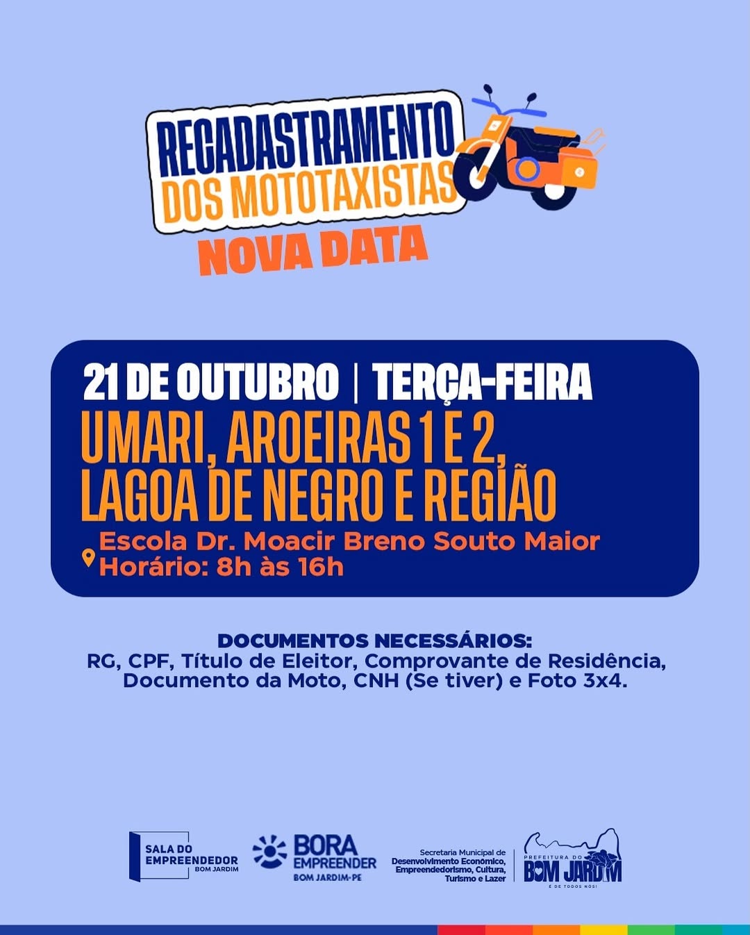 🚨 Atenção, mototaxistas! 🚨 Tem nova data para o recadastramento dos profissionais de Umari, Aroeiras 1 e 2, Lagoa de Negro e região! 🏍️ 📅 Dia: 21 de outubro (terça-feira) 📍 Local: Escola Dr. Moacir Breno Souto Maior 🕗 Horário: das 8h às 16h Não esqueça os documentos necessários: RG, CPF, Título de Eleitor, Comprovante de Residência, Documento da Moto, CNH (se tiver) e Foto 3×4.