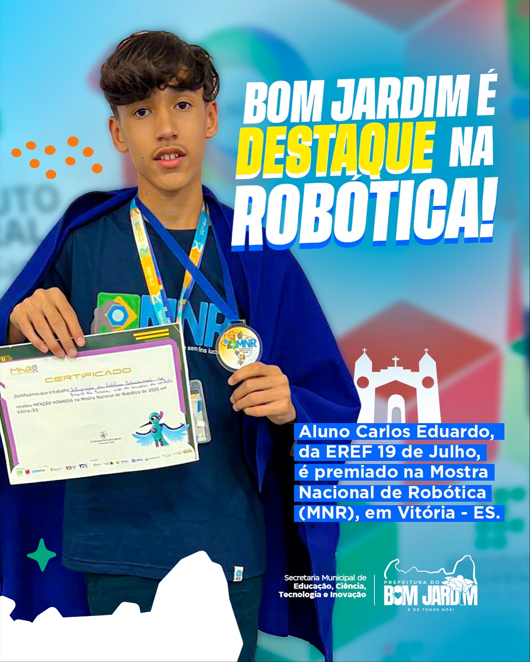 NOTÍCIA INCRÍVEL! BOM JARDIM É DESTAQUE NACIONAL NA ROBÓTICA! 🤖 Temos o prazer de anunciar que o projeto de robótica da EREF 19 de Julho, desenvolvido pelo aluno Carlos Eduardo, sob orientação do professor Marcone Fernandes, foi PREMIADO na Mostra Nacional de Robótica (MNR)! 🎉 O trabalho, intitulado “A Integração da Robótica Educacional no Ensino de Música: Uso de Sensores de Contato na Construção de um Piano”, foi um dos 62 trabalhos premiados dentre mais de 360 submetidos em todo o Brasil. 🇧🇷 A MNR é uma das mais importantes mostras de robótica da América Latina, onde nosso estudante apresentou o projeto presencialmente na MNR 2025, que ocorreu na Cidade da Inovação, em Vitória/ES, de 13 a 19 de outubro de 2025. Essa vitória é a prova do potencial transformador da educação aliada à robótica em Bom Jardim, incentivando o protagonismo estudantil e a inovação. Parabéns a Carlos Eduardo, ao Professor Marcone e a equipe da EREF 19 de Julho! Essa conquista é de toda a nossa rede de ensino!
