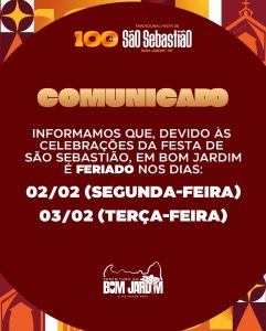 A Prefeitura de Bom Jardim informa que, em virtude das celebrações da tradicional Festa de São Sebastião — que este ano celebra seu centenário — é feriado municipal nos dias 02/02 (segunda-feira) e 03/02 (terça-feira).
