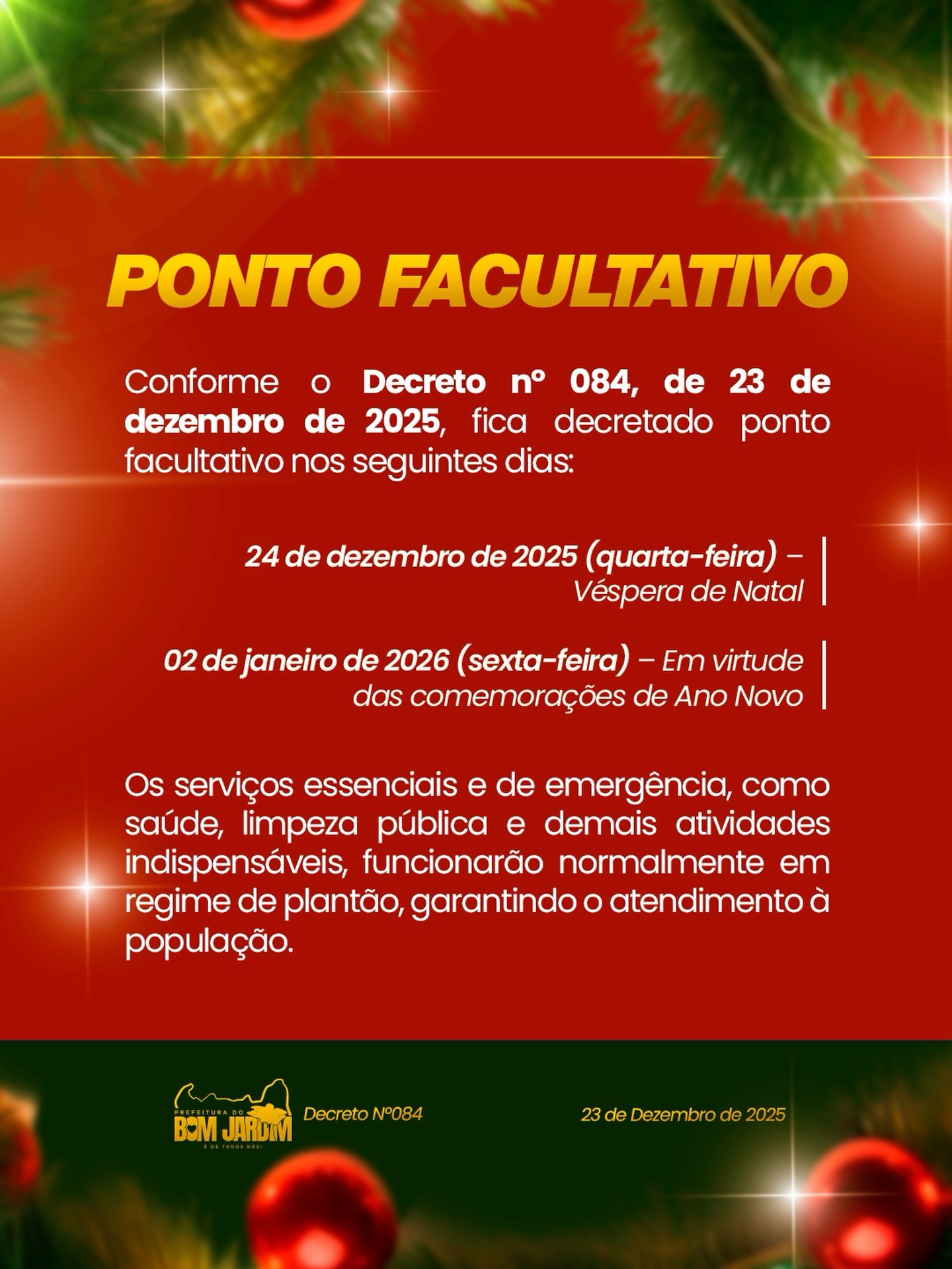 Conforme o Decreto nº 084/2025, foi decretado ponto facultativo nos dias: